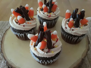 Chocolate cupcakes with peanut butter butter cream frosting. For a Sunday Lunch Welcome Potluck after church. They are supposed to be campfires. I might need to tweak this idea a little for the future. The candy corn is the flame and the Chocolate twizzlers are the logs. But either way they were delicious.